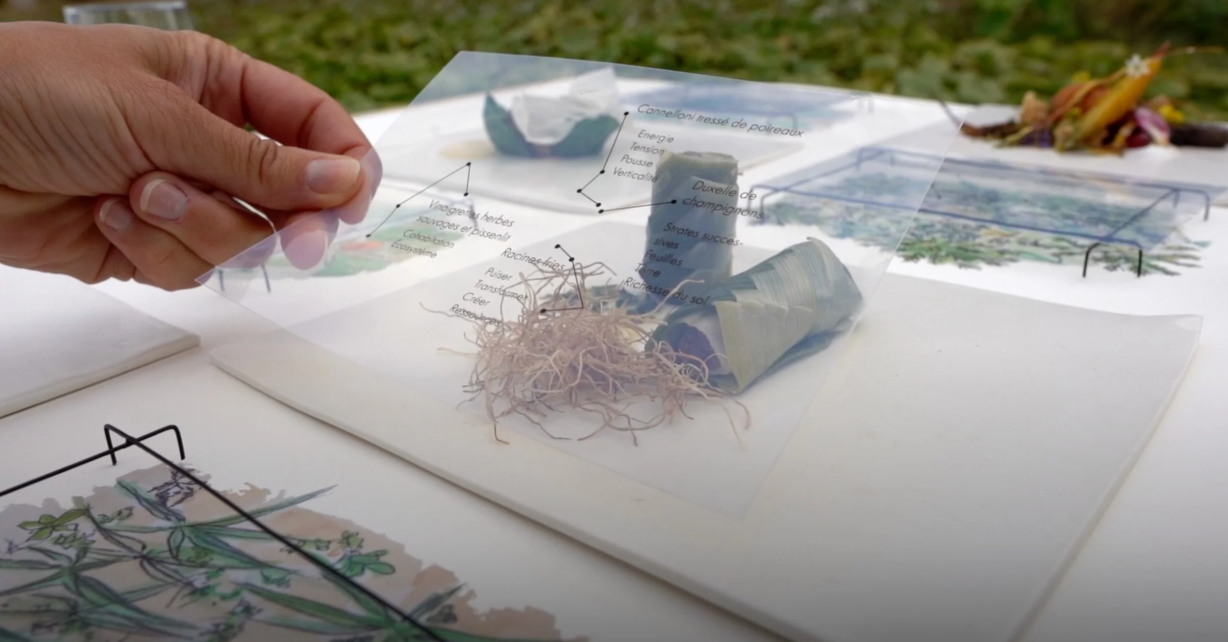 La dégustation est didactique et permet d’être acteur de la compréhension du potager et des liens entre les plantes « sauvages » et les légumes dans la parcelle, en observant les plats à partager grâce à une constellation sur calque qui traduit les énergies de la parcelle en saveur et composants du plat.