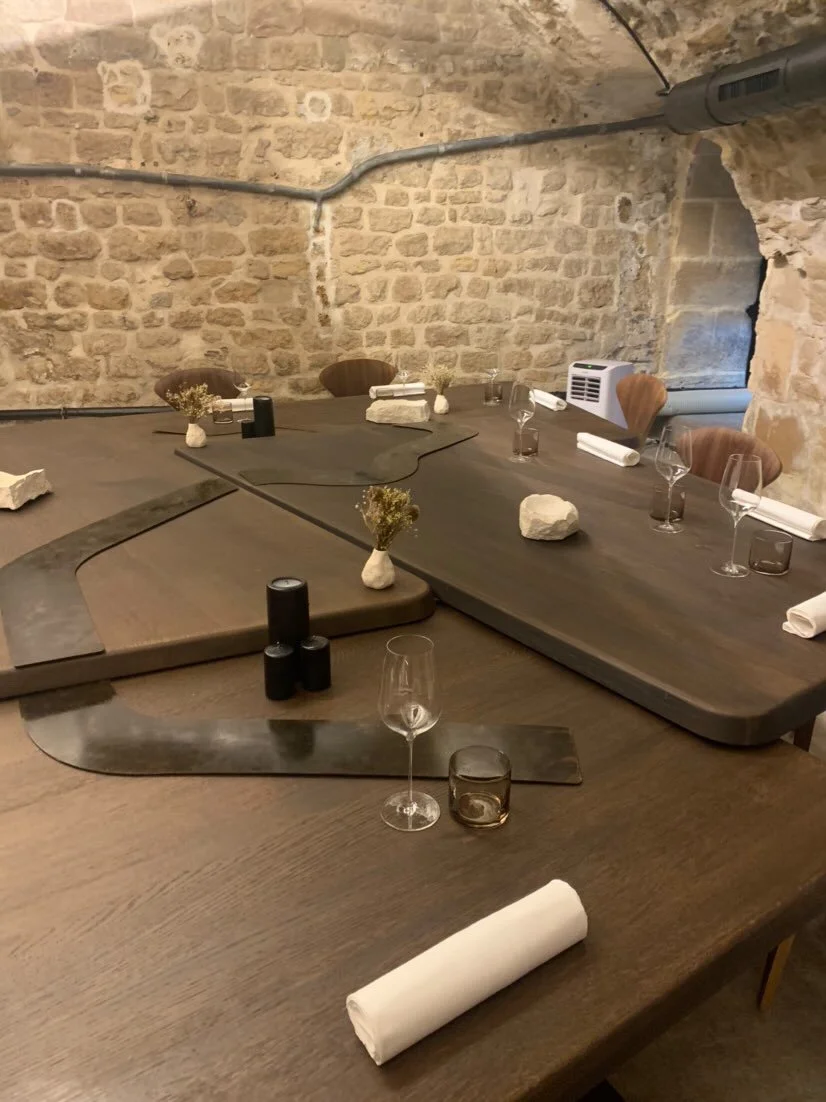 Ces panières en pierre brute de Massangis soulignent la voute de pierres calcaires du restaurant parisien.